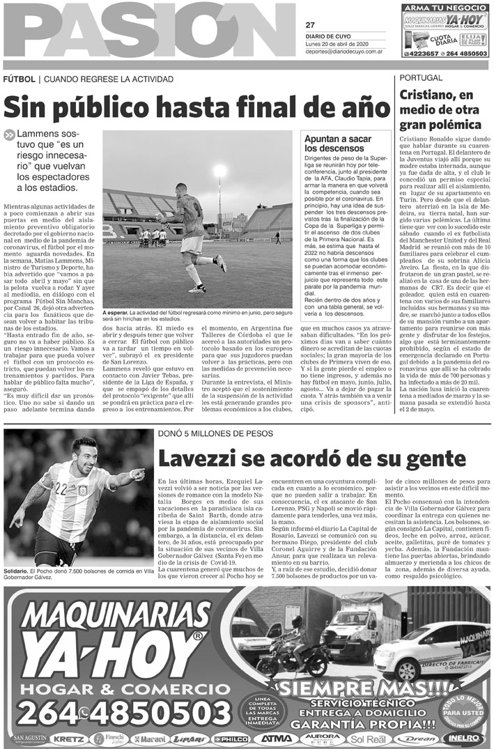 Diario de Cuyo | HOME | Noticias Tapa Pasión 20 de Abril del 2020 Por Redacción Diario de Cuyo 19/04/2020 · 0:00 Escuchar la noticia Escuchar la noticia Your browser doesn’t support HTML5 audio Ver los comentarios ›