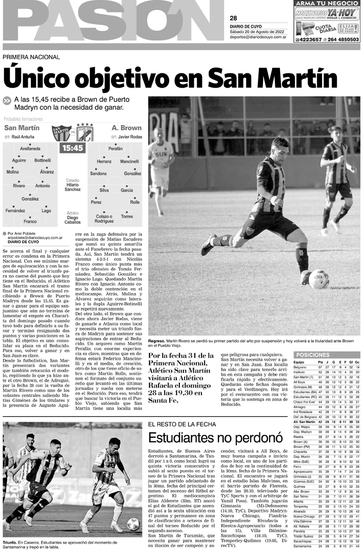 Diario de Cuyo | HOME | Noticias Tapa Pasión 20 de Agosto del 2022 Por Redacción Diario de Cuyo 19/08/2022 · 0:00 Escuchar la noticia Escuchar la noticia Your browser doesn’t support HTML5 audio Ver los comentarios ›