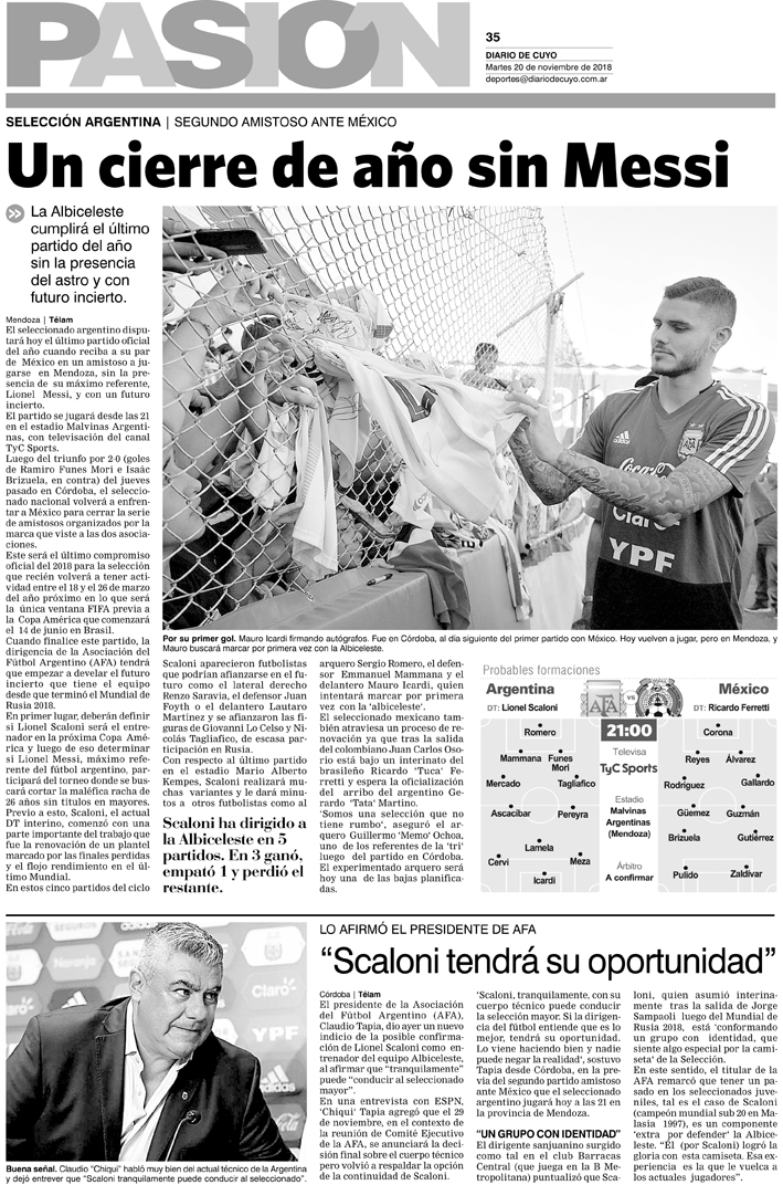 Diario de Cuyo | HOME | Noticias | Tapa Pasión Tapa Pasión 20 de Noviembre 2018 Por Redacción Diario de Cuyo 19/11/2018 · 0:00 Escuchar la noticia Escuchar la noticia Your browser doesn’t support HTML5 audio Tapa Pasión Ver los comentarios ›
