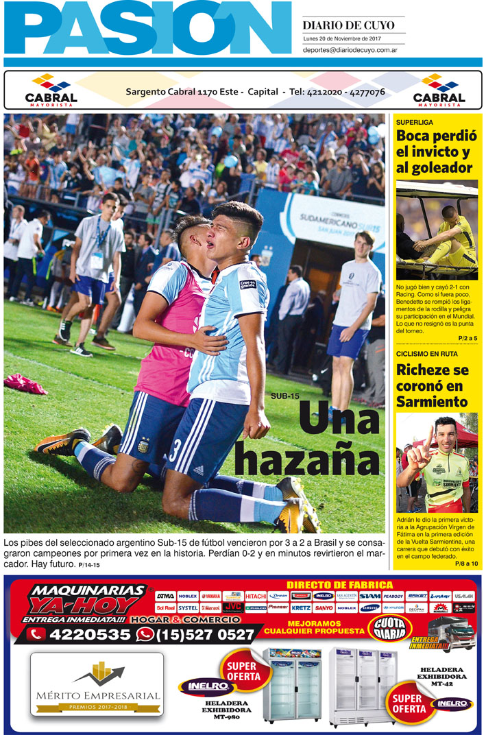Diario de Cuyo | HOME | Noticias | Tapa Pasión Tapa Pasión 20 de Noviembre de 2017 Por Redacción Diario de Cuyo 20/11/2017 · 0:00 Escuchar la noticia Escuchar la noticia Your browser doesn’t support HTML5 audio Tapa Pasión Ver los comentarios ›