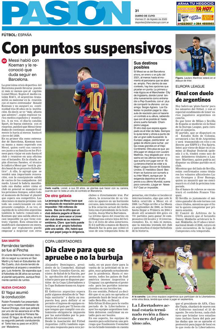 Diario de Cuyo | HOME | Noticias Tapa Pasión 21 de Agosto del 2020 Por Redacción Diario de Cuyo 20/08/2020 · 0:00 Escuchar la noticia Escuchar la noticia Your browser doesn’t support HTML5 audio Ver los comentarios ›