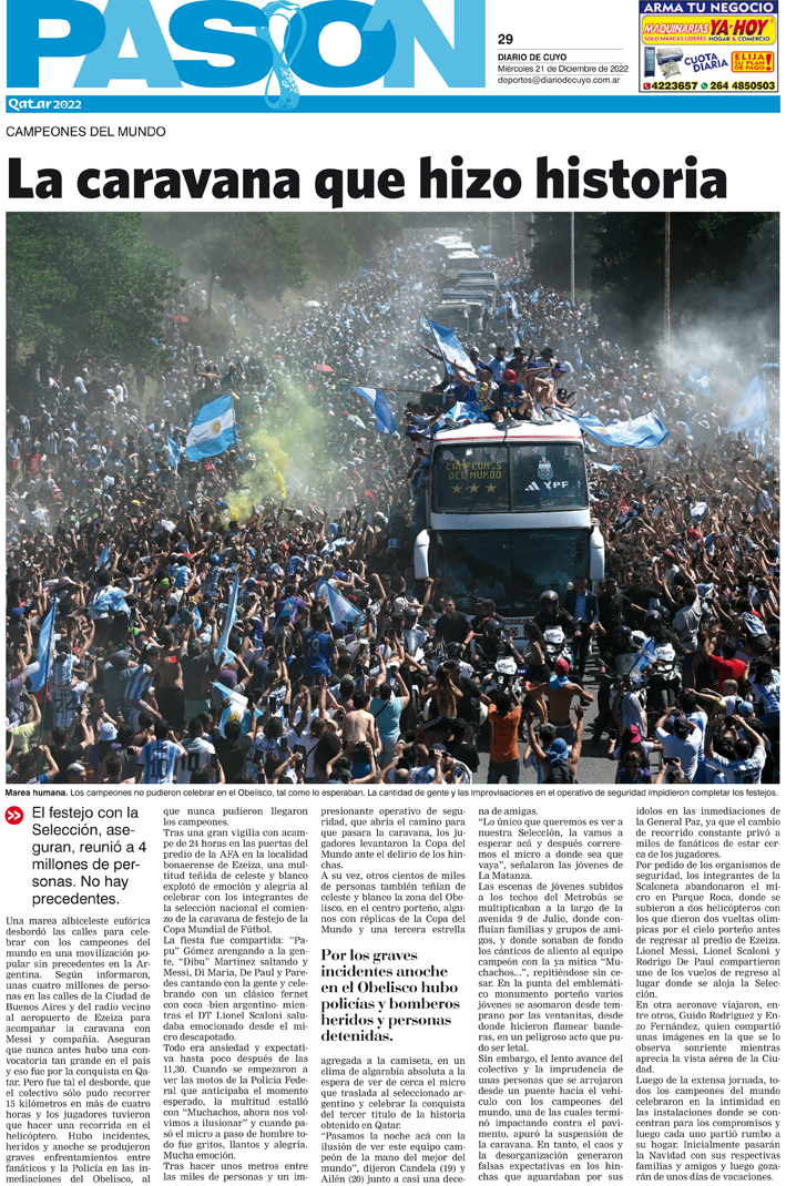 Diario de Cuyo | HOME | Noticias Tapa Pasión 21 de Diciembre del 2022 Por Redacción Diario de Cuyo 20/12/2022 · 0:00 Escuchar la noticia Escuchar la noticia Your browser doesn’t support HTML5 audio Ver los comentarios ›