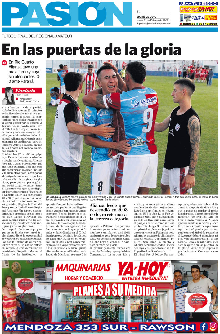 Diario de Cuyo | HOME | Noticias Tapa Pasión 21 de Febrero del 2022 Por Redacción Diario de Cuyo 21/02/2022 · 0:00 Escuchar la noticia Escuchar la noticia Your browser doesn’t support HTML5 audio Ver los comentarios ›