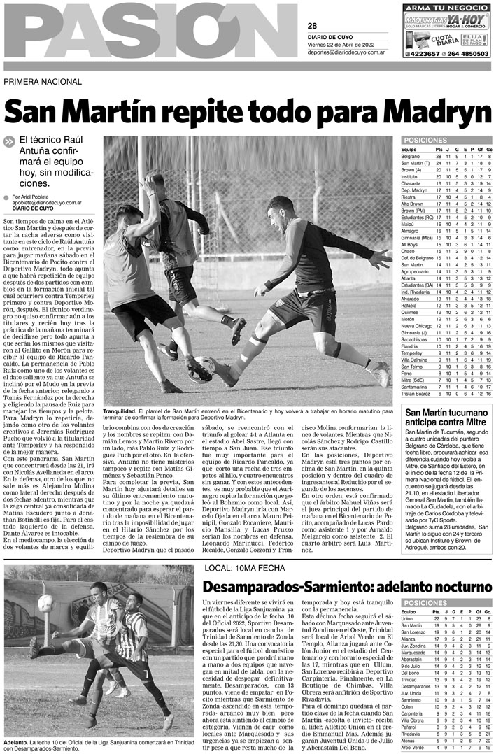 Diario de Cuyo | HOME | Noticias Tapa Pasión 22 de Abril de 2022 Por Redacción Diario de Cuyo 21/04/2022 · 0:00 Escuchar la noticia Escuchar la noticia Your browser doesn’t support HTML5 audio Ver los comentarios ›