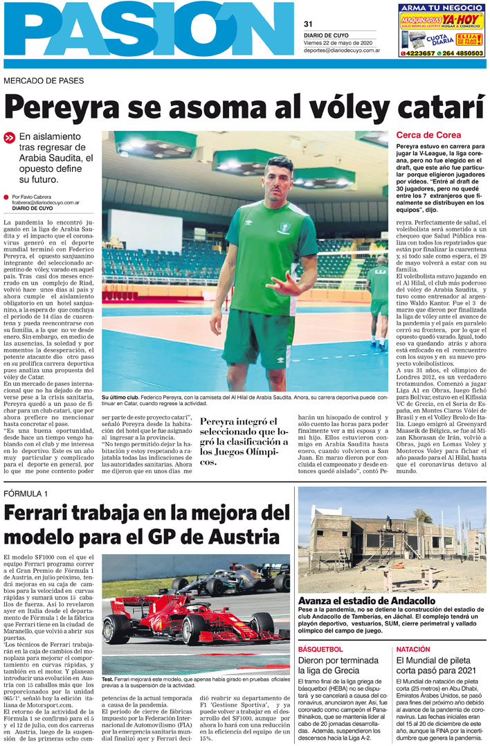 Diario de Cuyo | HOME | Noticias Tapa Pasión 22 de Mayo del 2020 Por Redacción Diario de Cuyo 21/05/2020 · 0:00 Escuchar la noticia Escuchar la noticia Your browser doesn’t support HTML5 audio Ver los comentarios ›