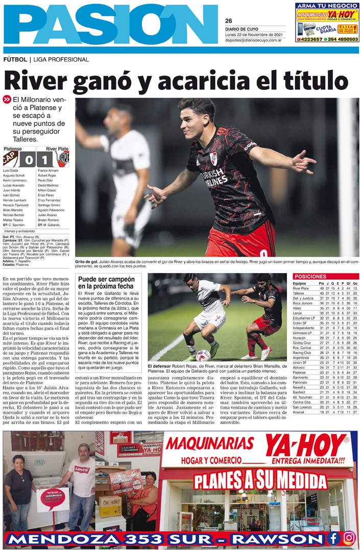 Diario de Cuyo | HOME | Noticias Tapa Pasión 22 de Noviembre del 2021 Por Redacción Diario de Cuyo 22/11/2021 · 0:00 Escuchar la noticia Escuchar la noticia Your browser doesn’t support HTML5 audio Ver los comentarios ›