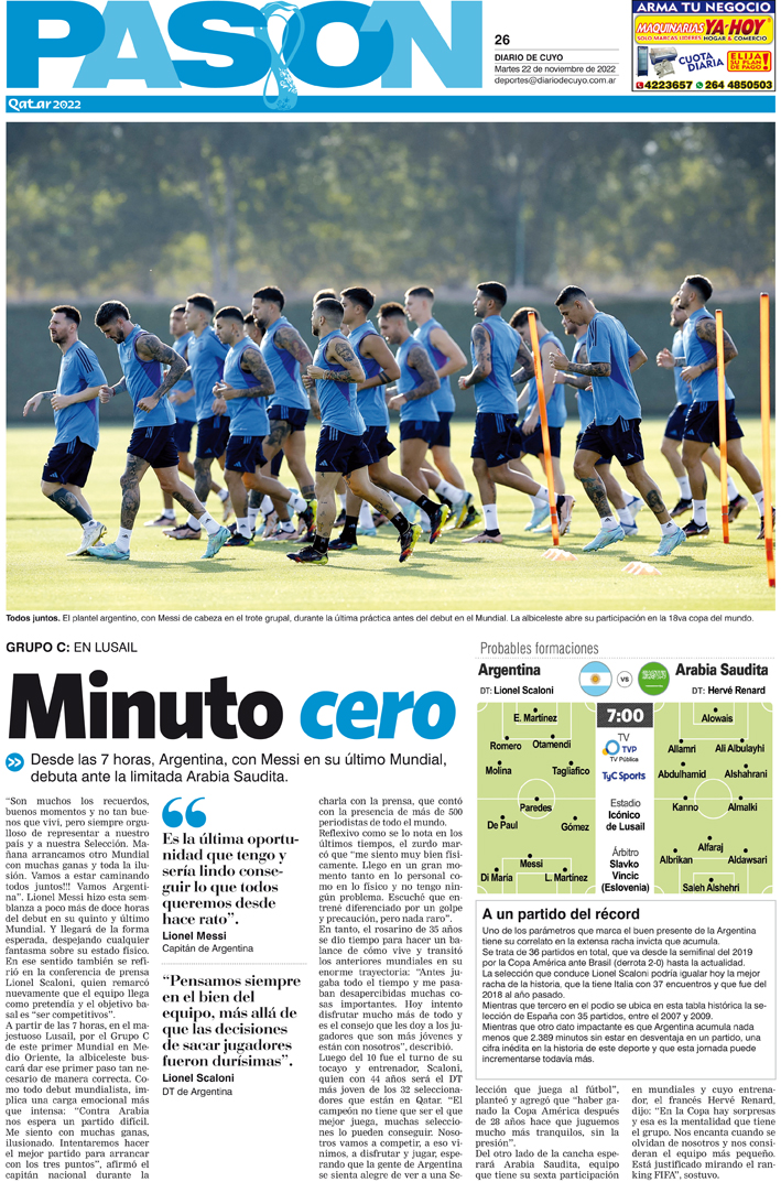 Diario de Cuyo | HOME | Noticias Tapa Pasión 22 de Noviembre del 2022 Por Redacción Diario de Cuyo 21/11/2022 · 0:00 Escuchar la noticia Escuchar la noticia Your browser doesn’t support HTML5 audio Ver los comentarios ›