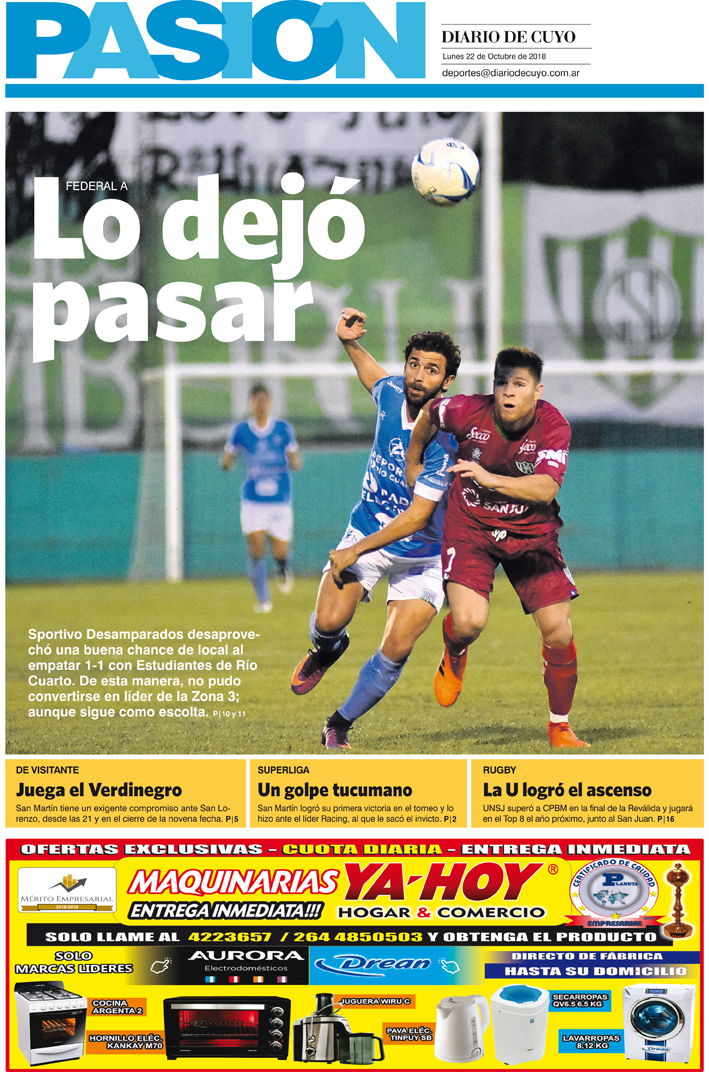 Diario de Cuyo | HOME | Noticias | Tapa Pasión Tapa Pasión 22 de Octubre de 2018 Por Redacción Diario de Cuyo 22/10/2018 · 0:00 Escuchar la noticia Escuchar la noticia Your browser doesn’t support HTML5 audio Tapa Pasión Ver los comentarios ›