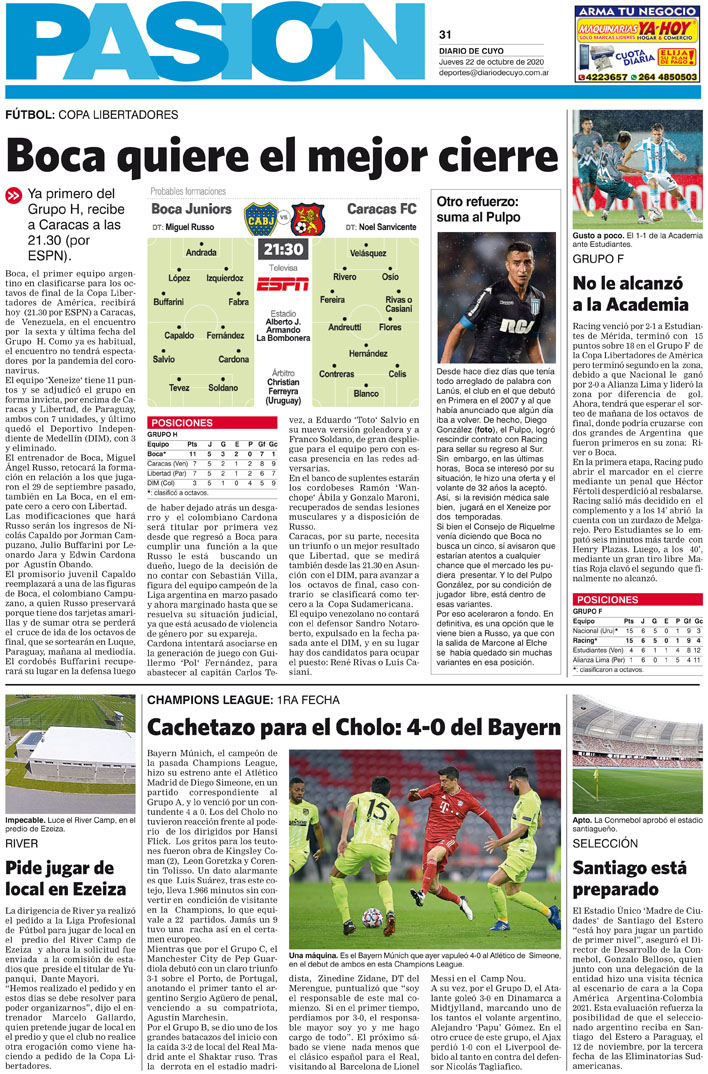 Diario de Cuyo | HOME | Noticias Tapa Pasión 22 de Octubre del 2020 Por Redacción Diario de Cuyo 21/10/2020 · 0:00 Escuchar la noticia Escuchar la noticia Your browser doesn’t support HTML5 audio Ver los comentarios ›