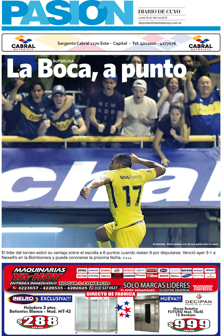Diario de Cuyo | HOME | Noticias | Tapa Pasión Tapa Pasión 23 de Abril 2018 Por Redacción Diario de Cuyo 23/04/2018 · 0:00 Escuchar la noticia Escuchar la noticia Your browser doesn’t support HTML5 audio Tapa Pasión Ver los comentarios ›