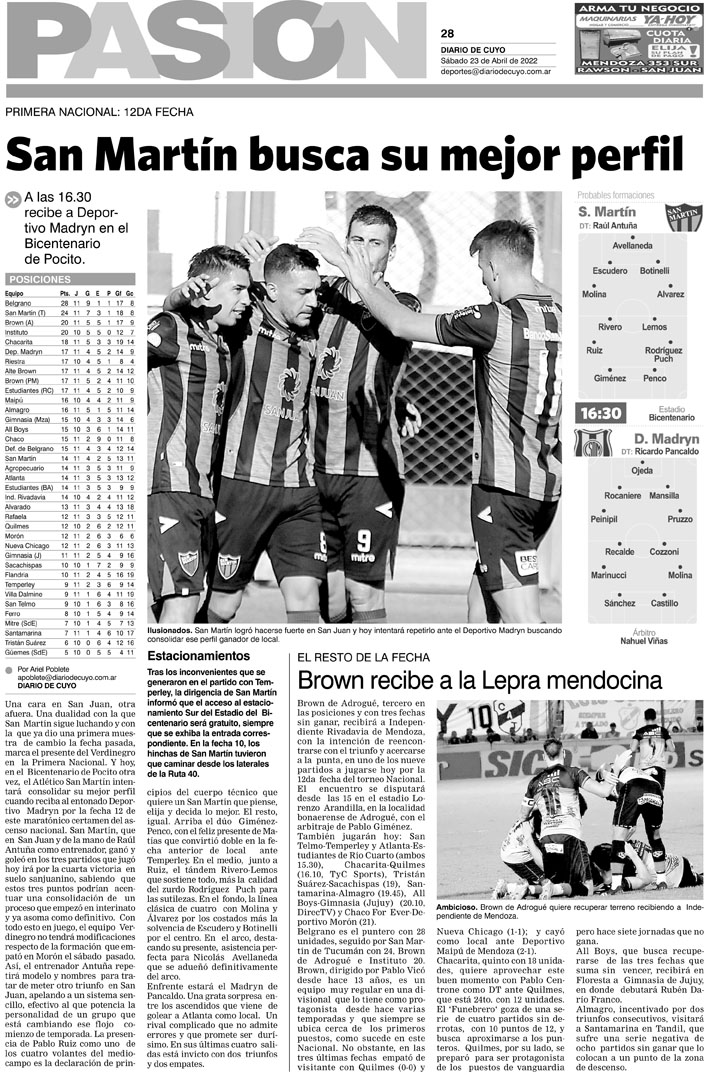 Diario de Cuyo | HOME | Noticias Tapa Pasión 23 de Abril de 2022 Por Redacción Diario de Cuyo 22/04/2022 · 0:00 Escuchar la noticia Escuchar la noticia Your browser doesn’t support HTML5 audio Ver los comentarios ›
