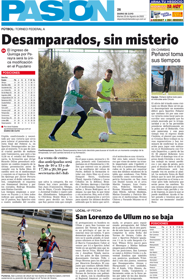 Diario de Cuyo | HOME | Noticias Tapa Pasión 23 de Agosto de 2022 Por Redacción Diario de Cuyo 22/08/2022 · 0:00 Escuchar la noticia Escuchar la noticia Your browser doesn’t support HTML5 audio Ver los comentarios ›