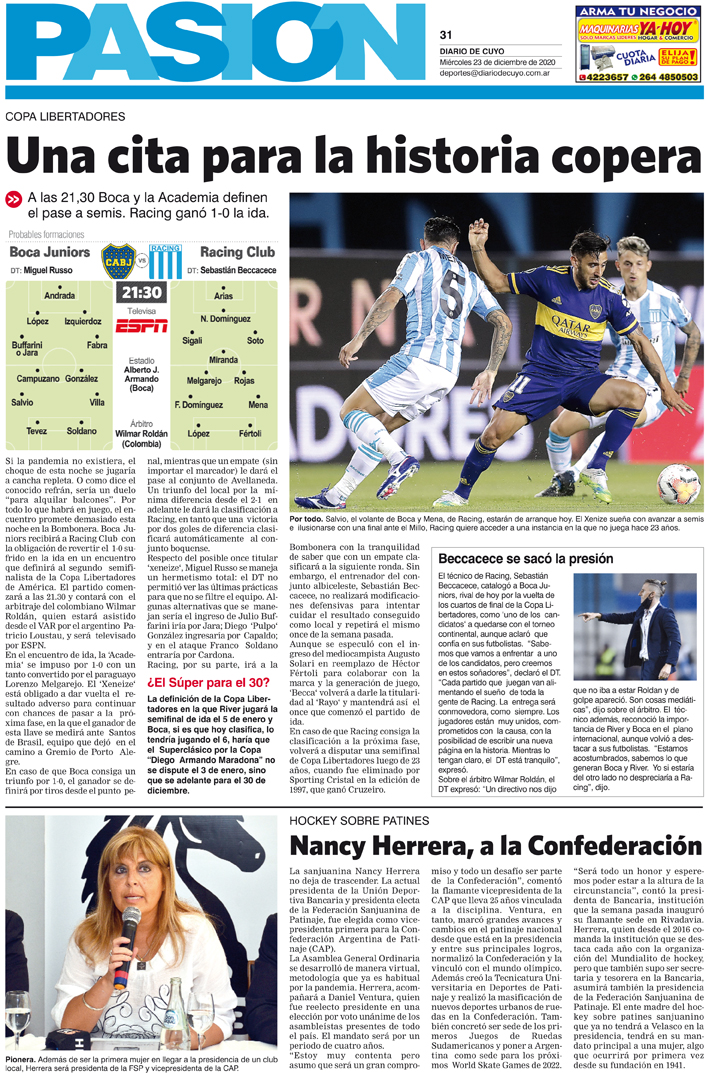 Diario de Cuyo | HOME | Noticias Tapa Pasión 23 de Diciembre del 2020 Por Redacción Diario de Cuyo 22/12/2020 · 0:00 Escuchar la noticia Escuchar la noticia Your browser doesn’t support HTML5 audio Ver los comentarios ›