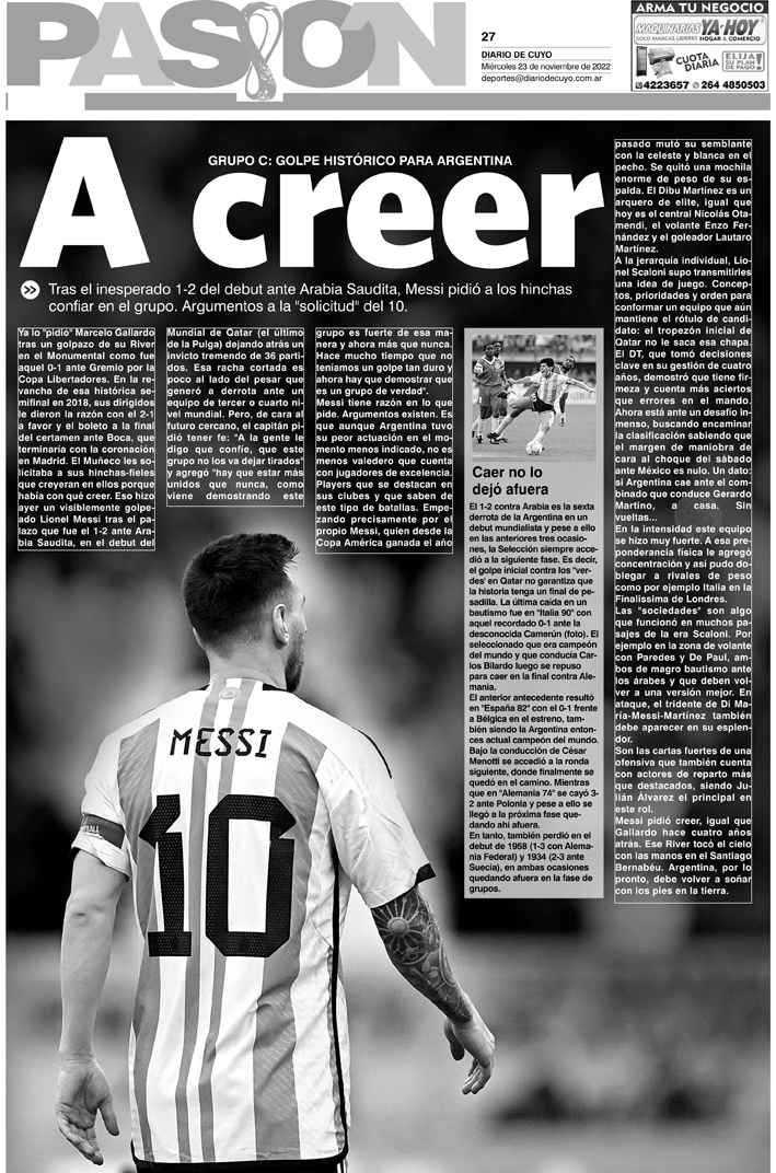 Diario de Cuyo | HOME | Noticias Tapa Pasión 23 de Noviembre del 2022 Por Redacción Diario de Cuyo 22/11/2022 · 0:00 Escuchar la noticia Escuchar la noticia Your browser doesn’t support HTML5 audio Ver los comentarios ›