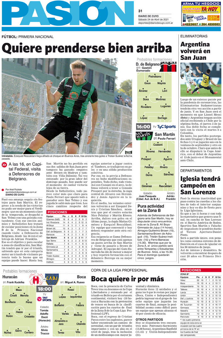 Diario de Cuyo | HOME | Noticias Tapa Pasión 24 de Abril del 2021 Por Redacción Diario de Cuyo 23/04/2021 · 0:00 Escuchar la noticia Escuchar la noticia Your browser doesn’t support HTML5 audio Ver los comentarios ›