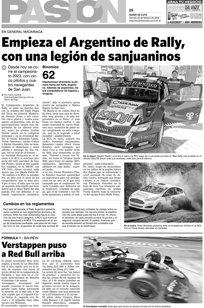 Diario de Cuyo | HOME | Noticias Tapa Pasión 24 de Febrero de 2023 Por Redacción Diario de Cuyo 23/02/2023 · 0:00 Escuchar la noticia Escuchar la noticia Your browser doesn’t support HTML5 audio Ver los comentarios ›