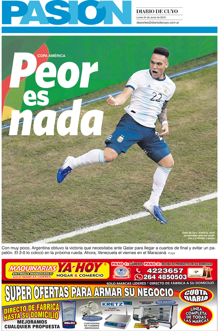 Diario de Cuyo | HOME | Noticias | Tapa Pasión Tapa Pasión 24 de Junio 2019 Por Redacción Diario de Cuyo 23/06/2019 · 0:00 Escuchar la noticia Escuchar la noticia Your browser doesn’t support HTML5 audio Tapa Pasión Ver los comentarios ›