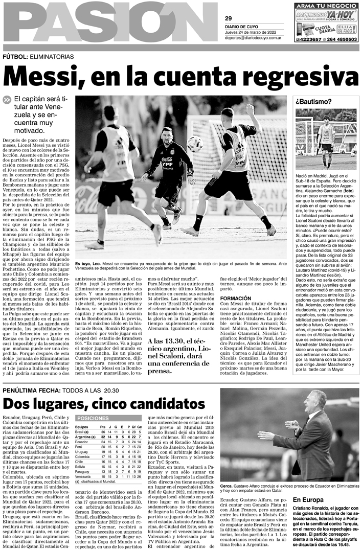 Diario de Cuyo | HOME | Noticias Tapa Pasión 24 de Marzo de 2022 Por Redacción Diario de Cuyo 23/03/2022 · 0:00 Escuchar la noticia Escuchar la noticia Your browser doesn’t support HTML5 audio Ver los comentarios ›