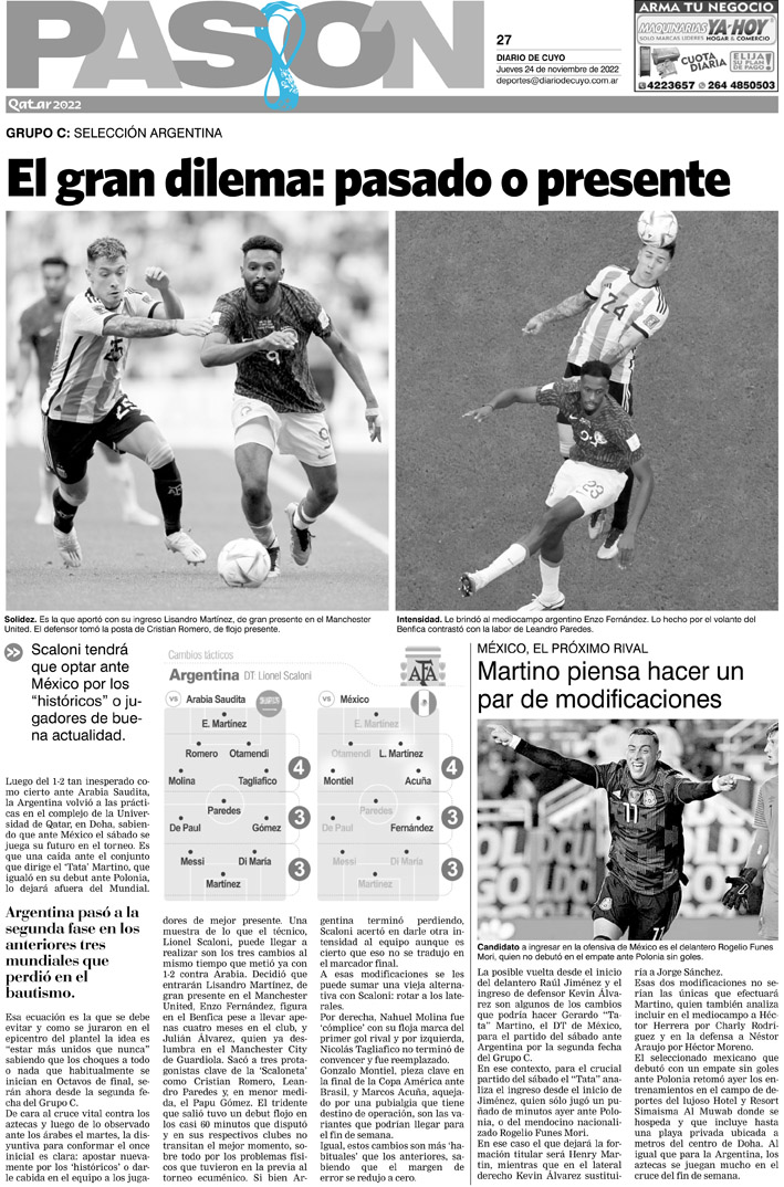 Diario de Cuyo | HOME | Noticias Tapa Pasión 24 de Noviembre de 2022 Por Redacción Diario de Cuyo 23/11/2022 · 0:00 Escuchar la noticia Escuchar la noticia Your browser doesn’t support HTML5 audio Ver los comentarios ›