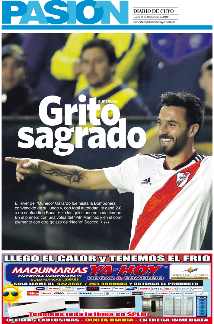 Diario de Cuyo | HOME | Noticias | Tapa Pasión Tapa Pasión 24 de Septiembre 2018 Por Redacción Diario de Cuyo 24/09/2018 · 0:00 Escuchar la noticia Escuchar la noticia Your browser doesn’t support HTML5 audio Tapa Pasión Ver los comentarios ›