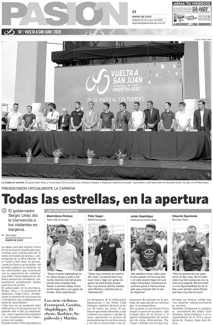 Diario de Cuyo | HOME | Noticias | Tapa Pasión Tapa Pasión 25 de Enero de 2020 Por Redacción Diario de Cuyo 24/01/2020 · 0:00 Escuchar la noticia Escuchar la noticia Your browser doesn’t support HTML5 audio Tapa Pasión Ver los comentarios ›