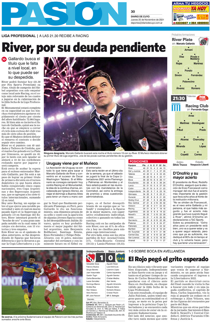 Diario de Cuyo | HOME | Noticias Tapa Pasión 25 de Noviembre del 2021 Por Redacción Diario de Cuyo 25/11/2021 · 0:00 Escuchar la noticia Escuchar la noticia Your browser doesn’t support HTML5 audio Ver los comentarios ›