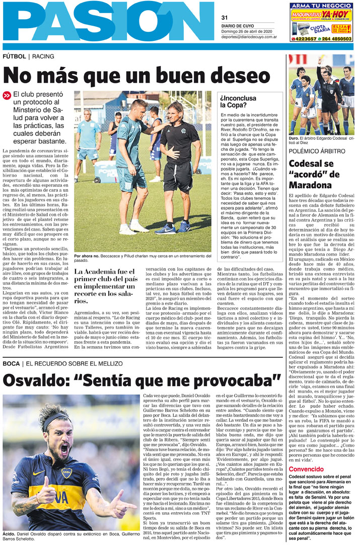 Diario de Cuyo | HOME | Noticias Tapa Pasión 26 de Abril del 2020 Por Redacción Diario de Cuyo 25/04/2020 · 0:00 Escuchar la noticia Escuchar la noticia Your browser doesn’t support HTML5 audio Ver los comentarios ›