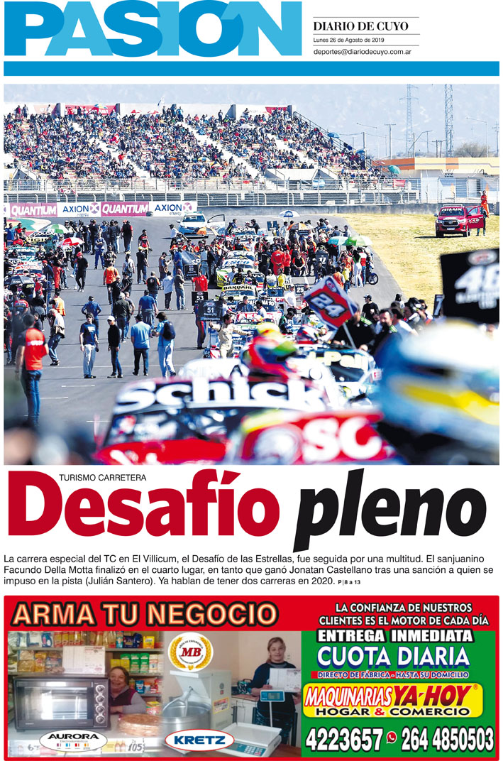 Diario de Cuyo | HOME | Noticias | Tapa Pasión Tapa Pasión 26 de Agosto de 2019 Por Redacción Diario de Cuyo 25/08/2019 · 0:00 Escuchar la noticia Escuchar la noticia Your browser doesn’t support HTML5 audio Tapa Pasión Ver los comentarios ›