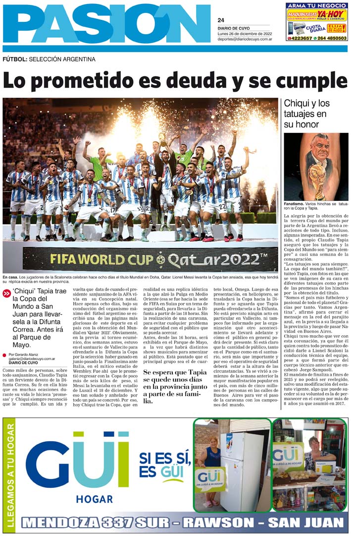 Diario de Cuyo | HOME | Noticias Tapa Pasión 26 de Diciembre de 2022 Por Redacción Diario de Cuyo 25/12/2022 · 0:00 Escuchar la noticia Escuchar la noticia Your browser doesn’t support HTML5 audio Ver los comentarios ›