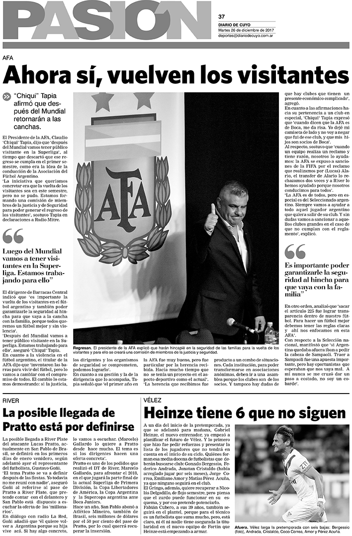 Diario de Cuyo | HOME | Noticias | Tapa Pasión Tapa Pasión 26 de Diciembre del 2017 Por Redacción Diario de Cuyo 25/12/2017 · 0:00 Escuchar la noticia Escuchar la noticia Your browser doesn’t support HTML5 audio Tapa Pasión Ver los comentarios ›