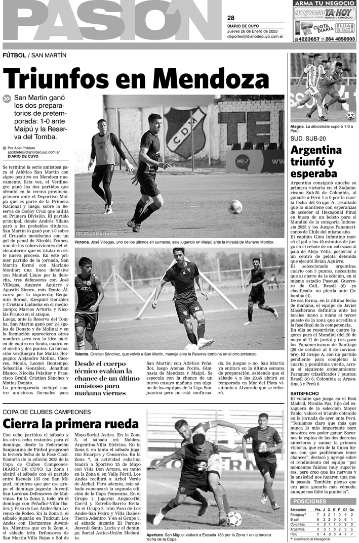Diario de Cuyo | HOME | Noticias Tapa Pasión 26 de Enero del 2023 Por Redacción Diario de Cuyo 25/01/2023 · 0:00 Escuchar la noticia Escuchar la noticia Your browser doesn’t support HTML5 audio Ver los comentarios ›