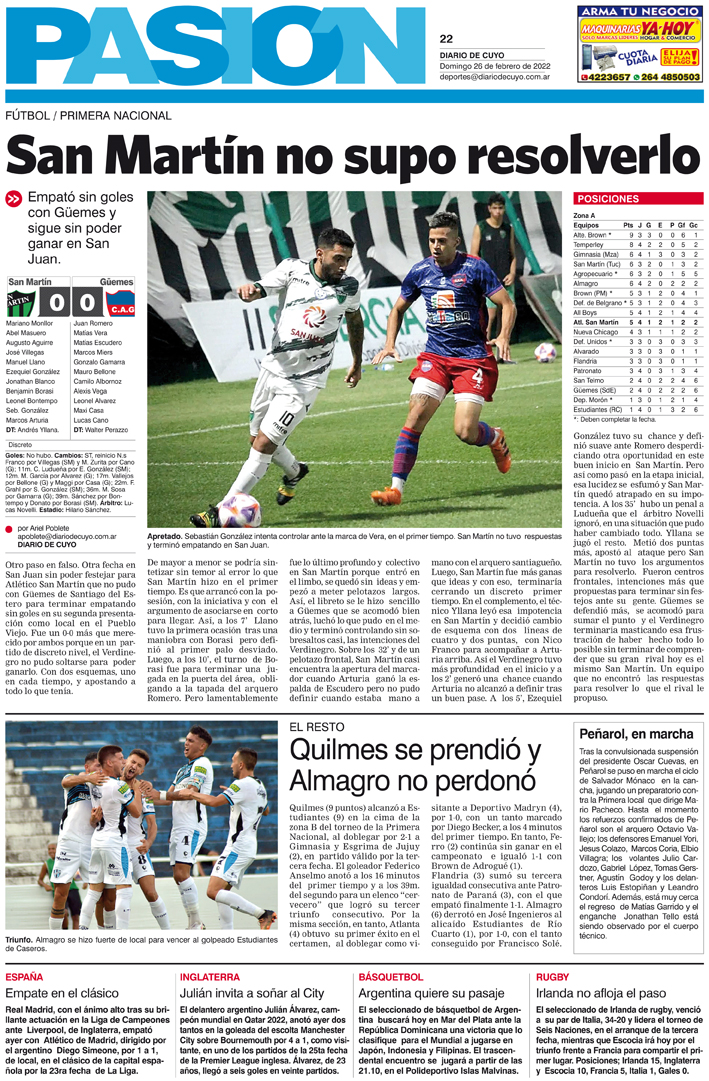 Diario de Cuyo | HOME | Noticias Tapa Pasión 26 de Febrero de 2023 Por Redacción Diario de Cuyo 25/02/2023 · 0:00 Escuchar la noticia Escuchar la noticia Your browser doesn’t support HTML5 audio Ver los comentarios ›