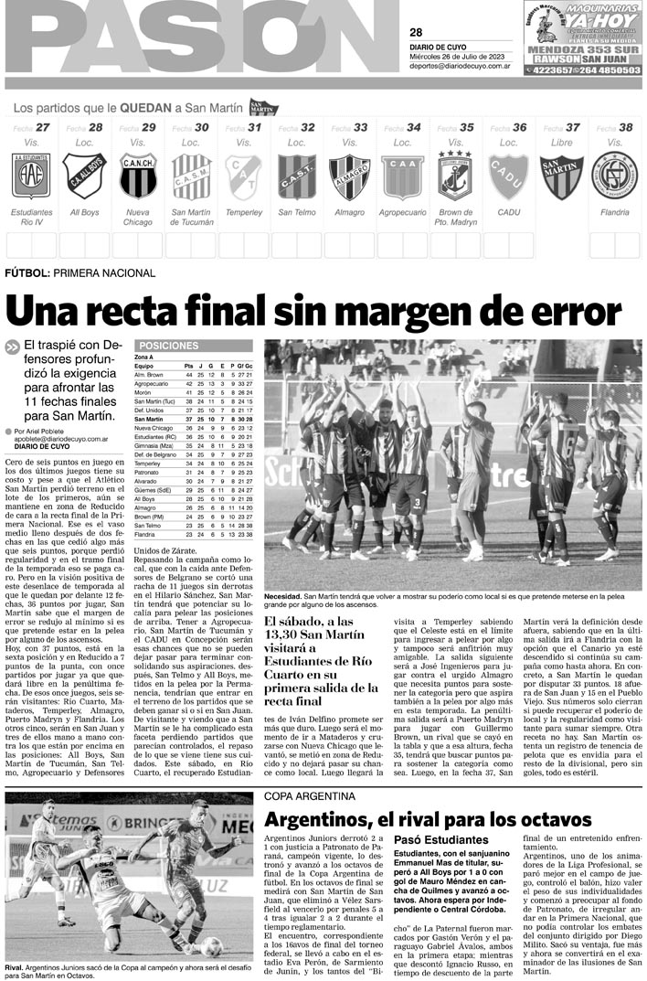 Diario de Cuyo | HOME | Noticias Tapa Pasión 26 de Julio del 2023 Por Redacción Diario de Cuyo 25/07/2023 · 0:00 Escuchar la noticia Escuchar la noticia Your browser doesn’t support HTML5 audio Ver los comentarios ›