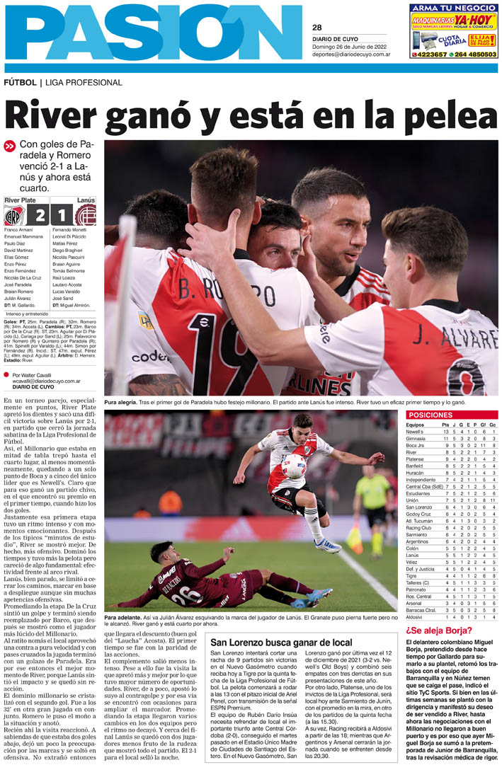 Diario de Cuyo | HOME | Noticias Tapa Pasión 26 de Junio del 2022 Por Redacción Diario de Cuyo 25/06/2022 · 0:00 Escuchar la noticia Escuchar la noticia Your browser doesn’t support HTML5 audio Ver los comentarios ›