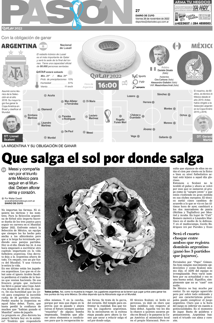 Diario de Cuyo | HOME | Noticias Tapa Pasión 26 de Noviembre del 2022 Por Redacción Diario de Cuyo 25/11/2022 · 0:00 Escuchar la noticia Escuchar la noticia Your browser doesn’t support HTML5 audio Ver los comentarios ›