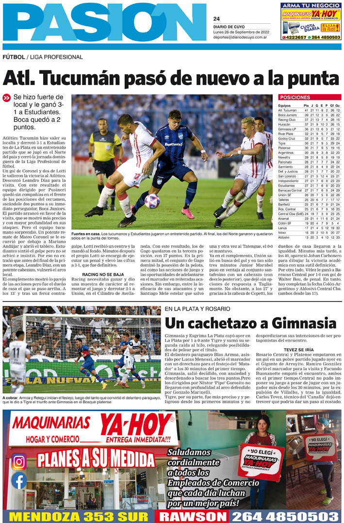 Diario de Cuyo | HOME | Noticias Tapa Pasión 26 de Septiembre del 2022 Por Redacción Diario de Cuyo 25/09/2022 · 0:00 Escuchar la noticia Escuchar la noticia Your browser doesn’t support HTML5 audio Ver los comentarios ›