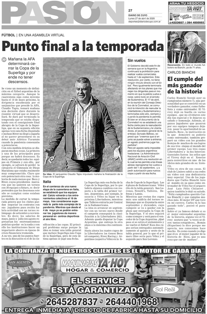 Diario de Cuyo | HOME | Noticias Tapa Pasión 27 de Abril del 2020 Por Redacción Diario de Cuyo 26/04/2020 · 0:00 Escuchar la noticia Escuchar la noticia Your browser doesn’t support HTML5 audio Ver los comentarios ›