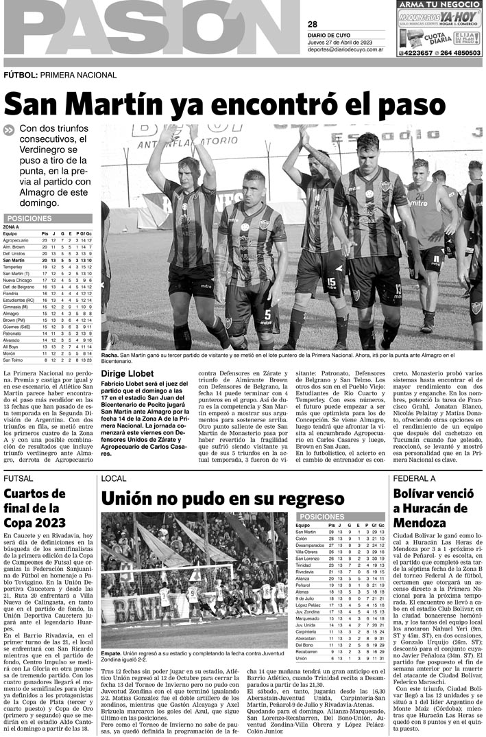 Diario de Cuyo | HOME | Noticias Tapa Pasión 27 de Abril del 2023 Por Redacción Diario de Cuyo 26/04/2023 · 0:00 Escuchar la noticia Escuchar la noticia Your browser doesn’t support HTML5 audio Ver los comentarios ›