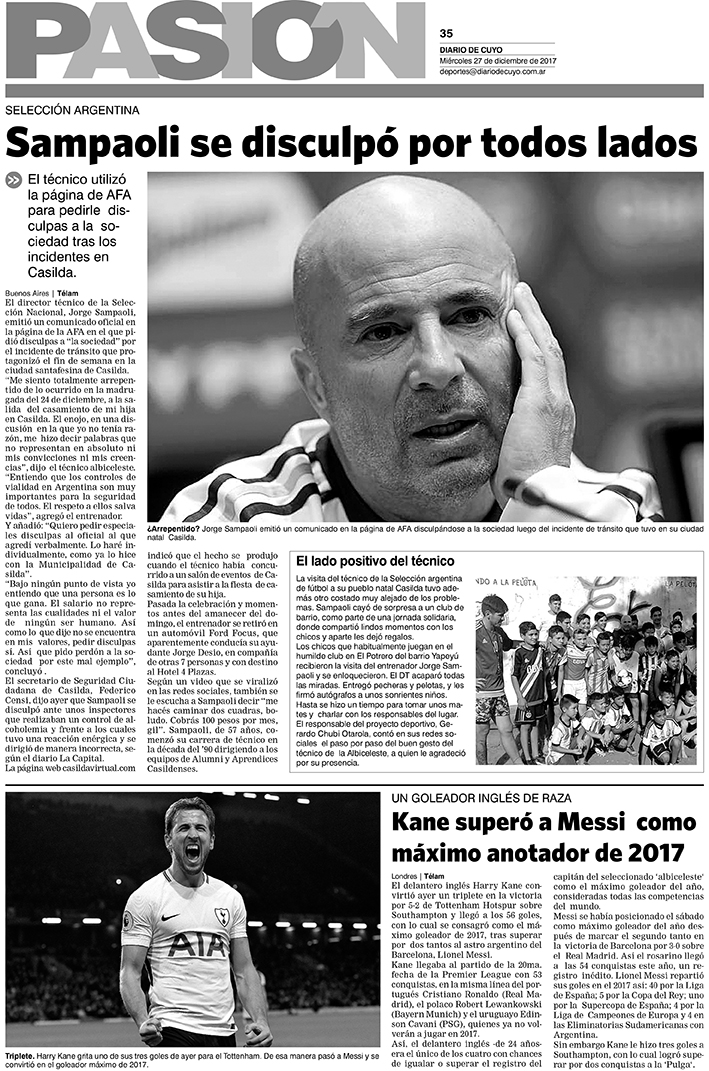 Diario de Cuyo | HOME | Noticias | Tapa Pasión Tapa Pasión 27 de Diciembre del 2017 Por Redacción Diario de Cuyo 26/12/2017 · 0:00 Escuchar la noticia Escuchar la noticia Your browser doesn’t support HTML5 audio Tapa Pasión Ver los comentarios ›
