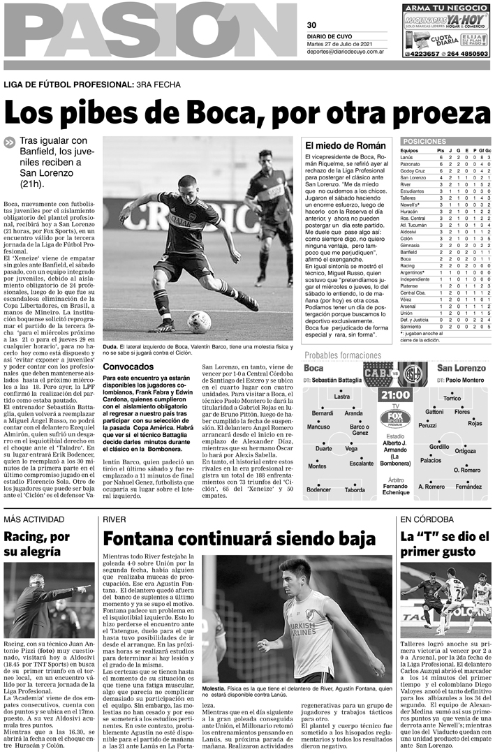 Diario de Cuyo | HOME | Noticias Tapa Pasión 27 de Julio del 2021 Por Redacción Diario de Cuyo 26/07/2021 · 0:00 Escuchar la noticia Escuchar la noticia Your browser doesn’t support HTML5 audio Ver los comentarios ›