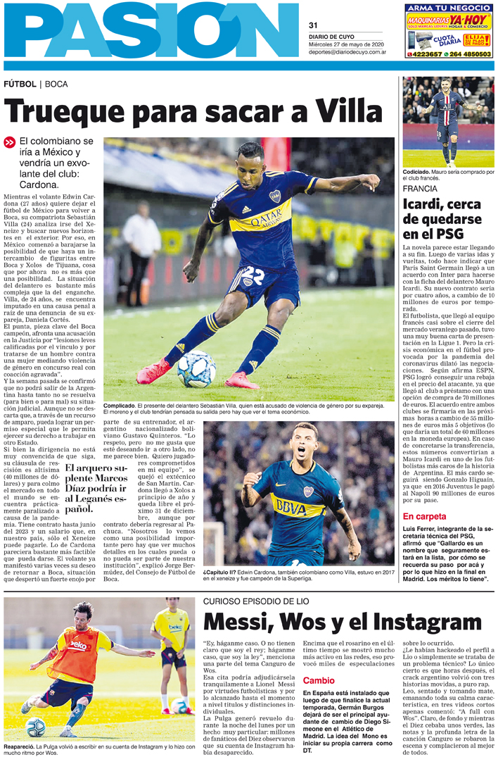 Diario de Cuyo | HOME | Noticias Tapa Pasión 27 de Mayo del 2020 Por Redacción Diario de Cuyo 26/05/2020 · 0:00 Escuchar la noticia Escuchar la noticia Your browser doesn’t support HTML5 audio Ver los comentarios ›