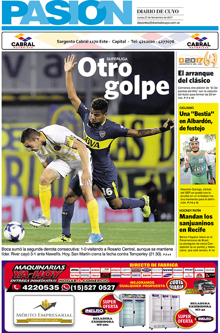 Diario de Cuyo | HOME | Noticias | Tapa Pasión Tapa Pasión 27 de Noviembre del 2017 Por Redacción Diario de Cuyo 27/11/2017 · 0:00 Escuchar la noticia Escuchar la noticia Your browser doesn’t support HTML5 audio Tapa Pasión Ver los comentarios ›