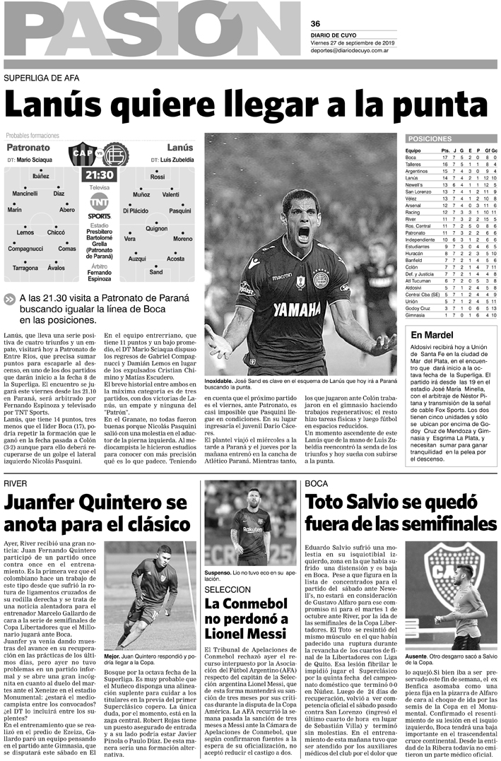 Diario de Cuyo | HOME | Noticias | Tapa Pasión Tapa Pasión 27 de Septiembre de 2019 Por Redacción Diario de Cuyo 26/09/2019 · 0:00 Escuchar la noticia Escuchar la noticia Your browser doesn’t support HTML5 audio Tapa Pasión Ver los comentarios ›