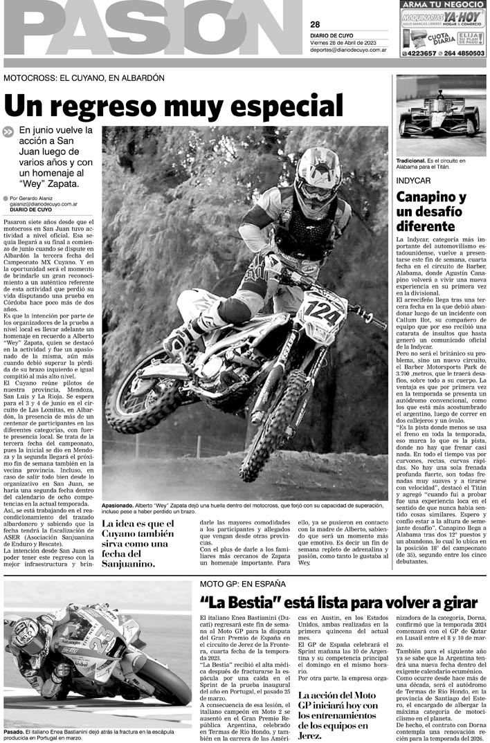 Diario de Cuyo | HOME | Noticias Tapa Pasión 28 de Abril del 2023 Por Redacción Diario de Cuyo 27/04/2023 · 0:00 Escuchar la noticia Escuchar la noticia Your browser doesn’t support HTML5 audio Ver los comentarios ›