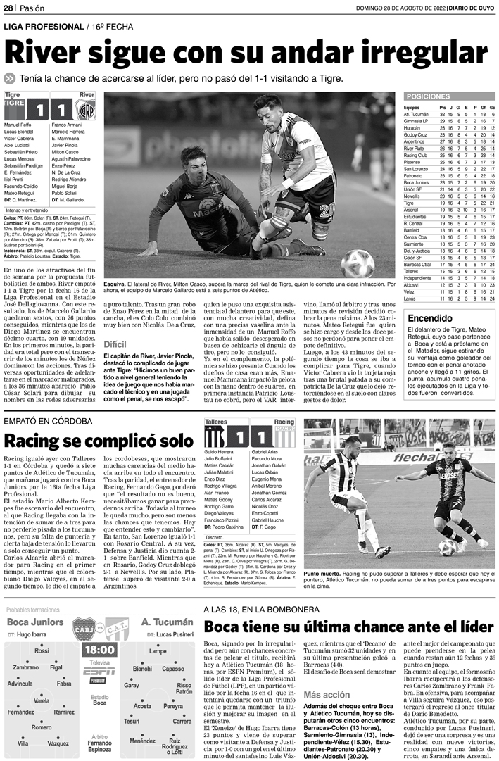 Diario de Cuyo | HOME | Noticias Tapa Pasión 28 de Agosto de 2022 Por Redacción Diario de Cuyo 27/08/2022 · 0:00 Escuchar la noticia Escuchar la noticia Your browser doesn’t support HTML5 audio Ver los comentarios ›