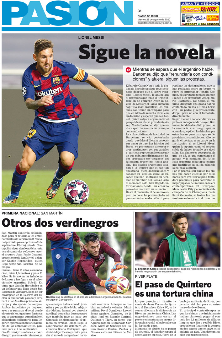Diario de Cuyo | HOME | Noticias Tapa Pasión 28 de Agosto del 2020 Por Redacción Diario de Cuyo 27/08/2020 · 0:00 Escuchar la noticia Escuchar la noticia Your browser doesn’t support HTML5 audio Ver los comentarios ›