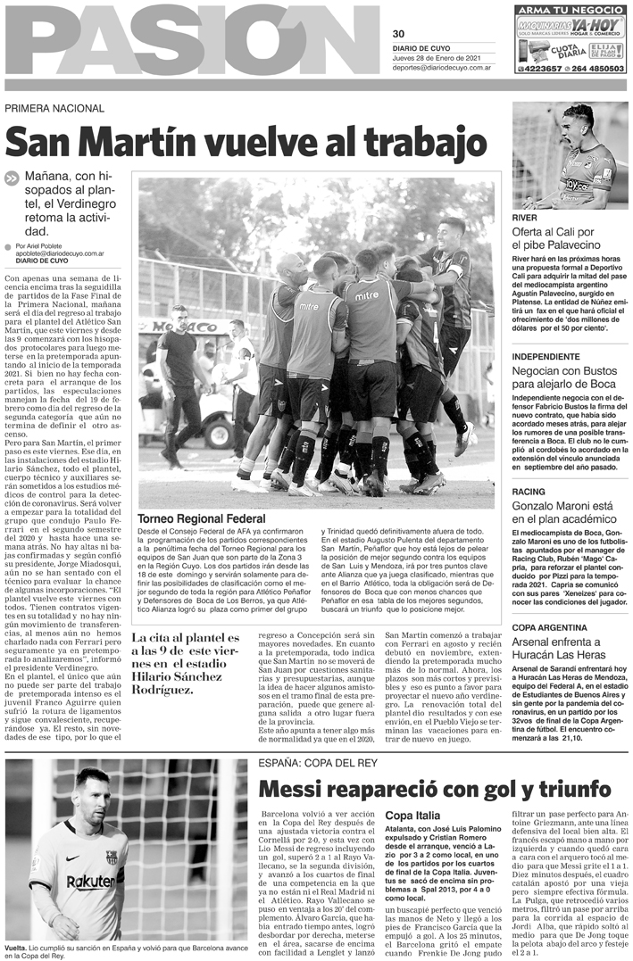 Diario de Cuyo | HOME | Noticias Tapa Pasión 28 de Enero del 2021 Por Redacción Diario de Cuyo 27/01/2021 · 0:00 Escuchar la noticia Escuchar la noticia Your browser doesn’t support HTML5 audio Ver los comentarios ›