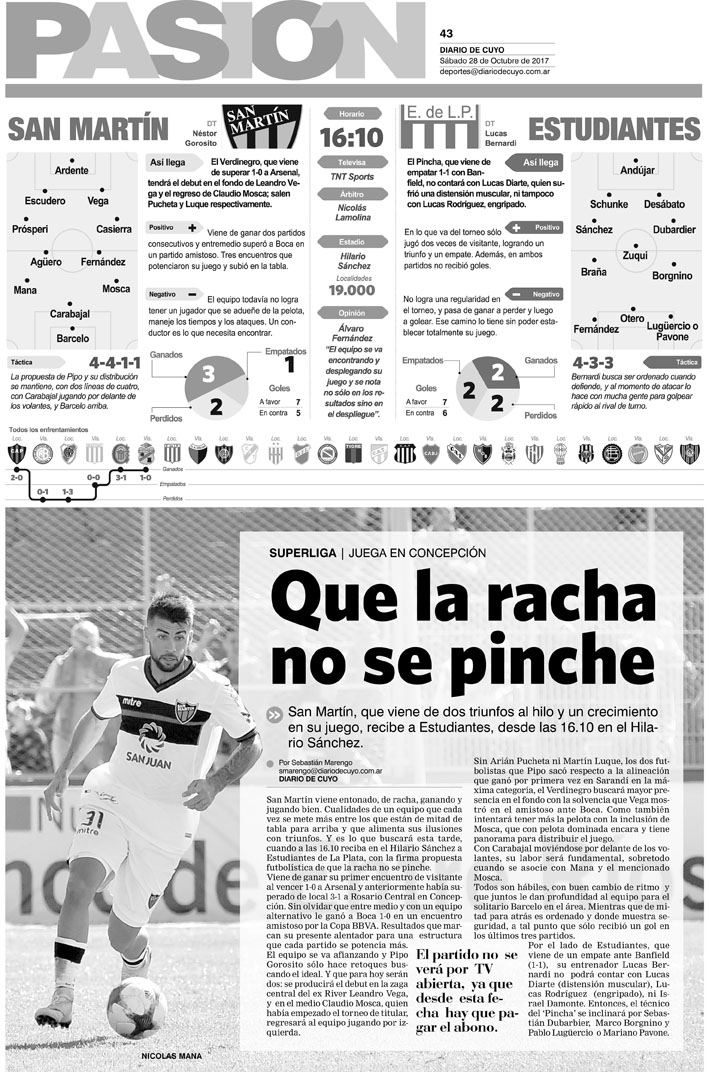 Diario de Cuyo | HOME | Noticias | Tapa Pasión Tapa Pasión 28 de Octubre de 2017 Por Redacción Diario de Cuyo 27/10/2017 · 0:00 Escuchar la noticia Escuchar la noticia Your browser doesn’t support HTML5 audio Tapa Pasión Ver los comentarios ›