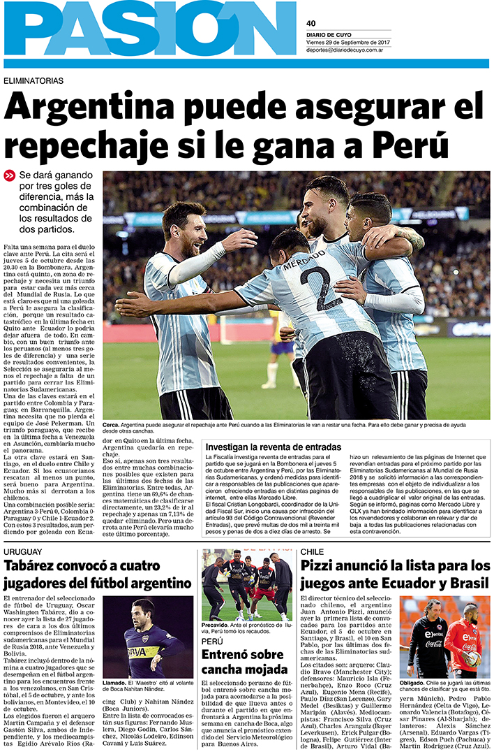 Diario de Cuyo | HOME | Noticias | Tapa Pasión Tapa Pasión 29 de Septiembre del 2017 Por Redacción Diario de Cuyo 28/09/2017 · 0:00 Escuchar la noticia Escuchar la noticia Your browser doesn’t support HTML5 audio Tapa Pasión Ver los comentarios ›