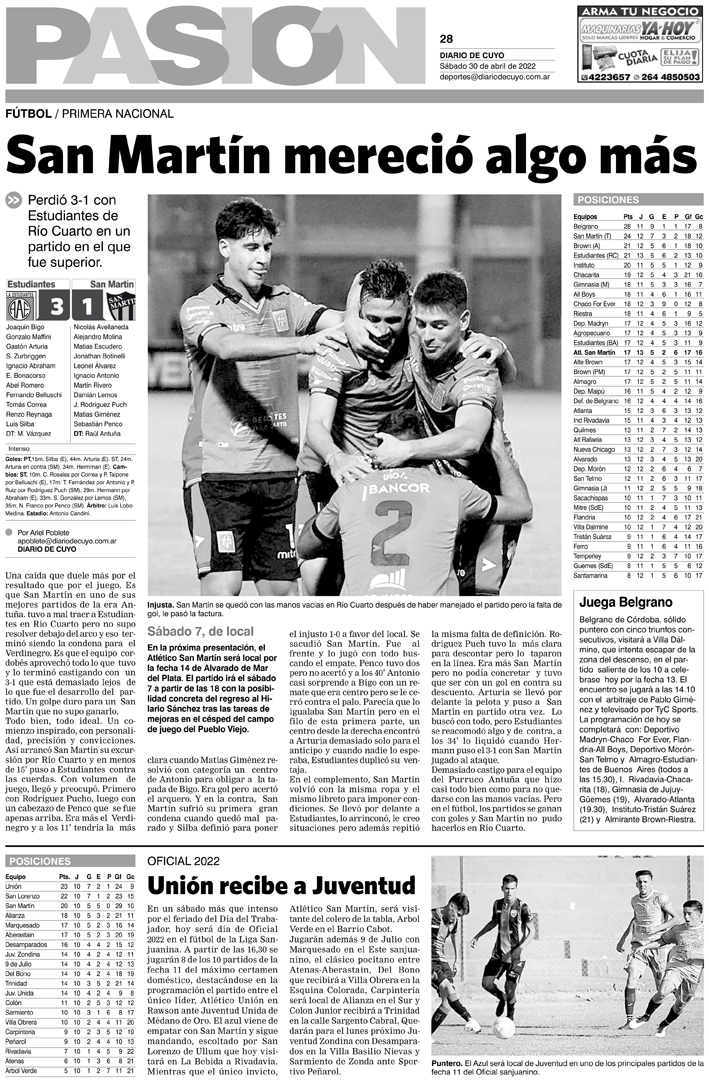 Diario de Cuyo | HOME | Noticias Tapa Pasión 30 de Abril de 2022 Por Redacción Diario de Cuyo 30/04/2022 · 0:00 Escuchar la noticia Escuchar la noticia Your browser doesn’t support HTML5 audio Ver los comentarios ›